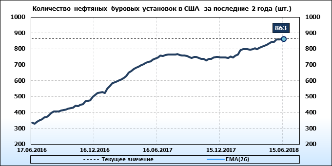По сообщению Baker Hughes количество нефтяных буровых установок в США на 15.06.18 составило 863 штуки. За неделю количество буровых установок выросло на 1 единицу.