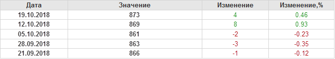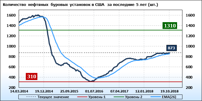 По сообщению Baker Hughes количество нефтяных буровых установок в США на 19.10.18 составило 873 штуки. За неделю количество буровых установок выросло на 4 единицы.