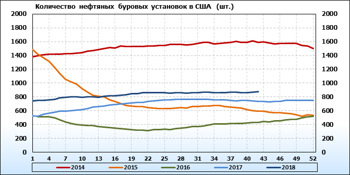 Baker Hughes. Количество буровых установок в США. Данные на 19.10.2018
