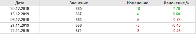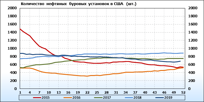 По сообщению Baker Hughes количество нефтяных буровых установок в США на 20.12.19 составило 685 штук. За неделю количество буровых установок выросло на 18 единиц. На прошлой неделе количество установок, которые прекратили работу составило 8 единиц. Количество установок, которые ввели в эксплуатацию составило 26 единиц. По итогам недели рост количества установок очевиден.