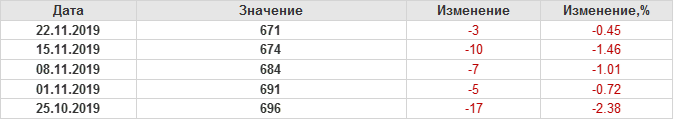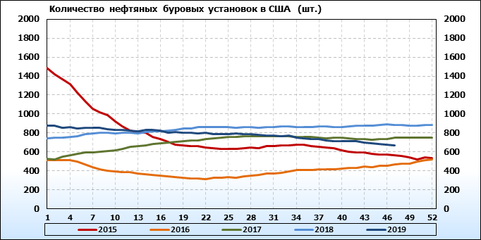 По сообщению Baker Hughes количество нефтяных буровых установок в США на 22.11.19 составило 671 штуку. За неделю количество буровых установок упало на 3 единицы. На прошлой неделе количество установок, которые прекратили работу составило 6 единиц. Количество установок, которые ввели в эксплуатацию составило 3 единицы. Видим, что по итогам недели падение числа установок незначительное.