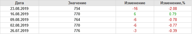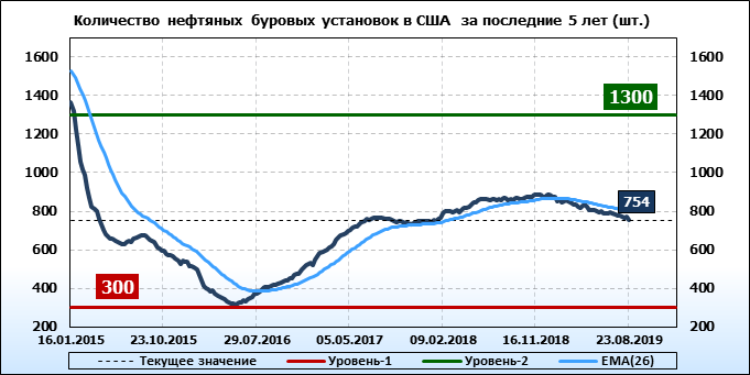 По сообщению Baker Hughes количество нефтяных буровых установок в США на 23.08.19 составило 754 штуки. За неделю количество буровых установок упало на 16 единиц. На прошлой неделе количество установок, которые прекратили работу составило 17 единиц. Количество установок, которые ввели в эксплуатацию составило 1 единицу. По итогам недели наблюдаем существенное сокращение буровых.