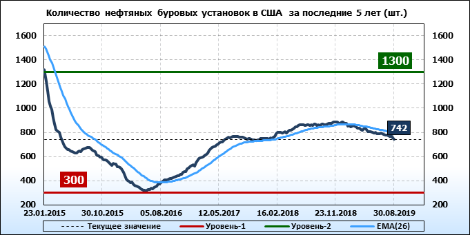 По сообщению Baker Hughes количество нефтяных буровых установок в США на 30.08.19 составило 742 штуки. За неделю количество буровых установок упало на 12 единиц. На прошлой неделе количество установок, которые прекратили работу составило 16 единиц. Количество установок, которые ввели в эксплуатацию составило 4 единицы. По итогам недели наблюдаем существенное сокращение буровых.