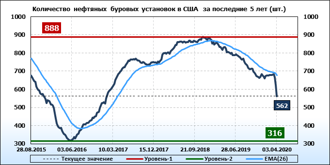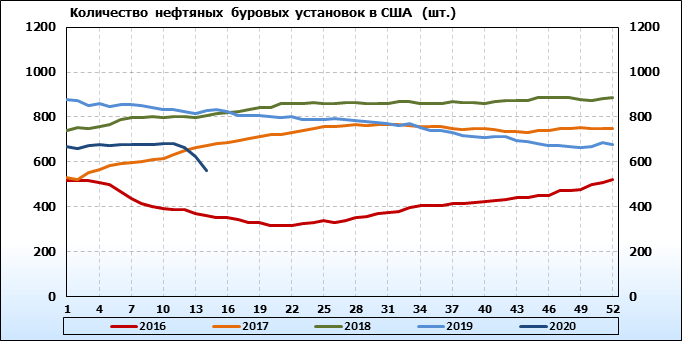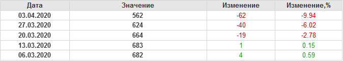 По сообщению Baker Hughes количество нефтяных буровых установок в США на 03.04.20 составило 562 штуки. За неделю количество буровых установок упало на 62 единицы. На прошлой неделе количество установок, которые прекратили работу составило 62 единицы. В течение прошедшей недели ни одна установка в строй не вводилась. По итогам недели наблюдаем существенное сокращение буровых.