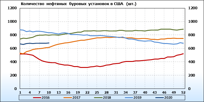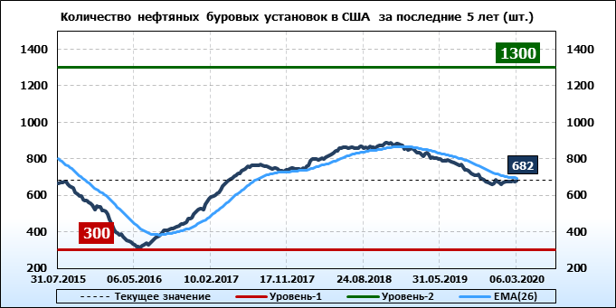 По сообщению Baker Hughes количество нефтяных буровых установок в США на 06.03.20 составило 682 штуки. За неделю количество буровых установок выросло на 4 единицы. На прошлой неделе количество установок, которые прекратили работу составило 4 единицы. Количество установок, которые ввели в эксплуатацию составило 8 единиц. Как видим, рост числа установок есть, но он незначительный.