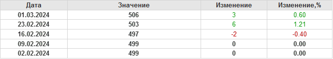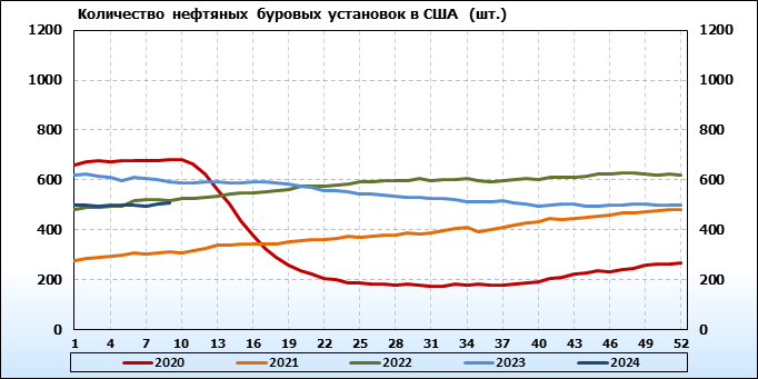По сообщению Baker Hughes количество нефтяных буровых установок в США на 01.03.24 составило 506 штук. За неделю количество буровых установок выросло на 3 единицы. За прошедшую неделю не было ни одной установки, которая бы прекратила работу. Количество установок, которые ввели в эксплуатацию составило 3 единицы. Как видим, рост числа установок есть, но он незначительный.