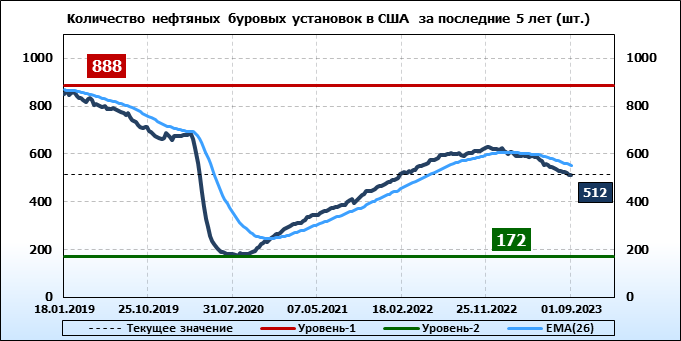 По сообщению Baker Hughes количество нефтяных буровых установок в США на 01.09.23 составило 512 штук. За неделю количество буровых установок осталось неизменным. На прошлой неделе количество установок, которые прекратили работу составило 4 единицы. Количество установок, которые ввели в эксплуатацию составило 4 единицы.