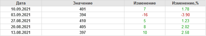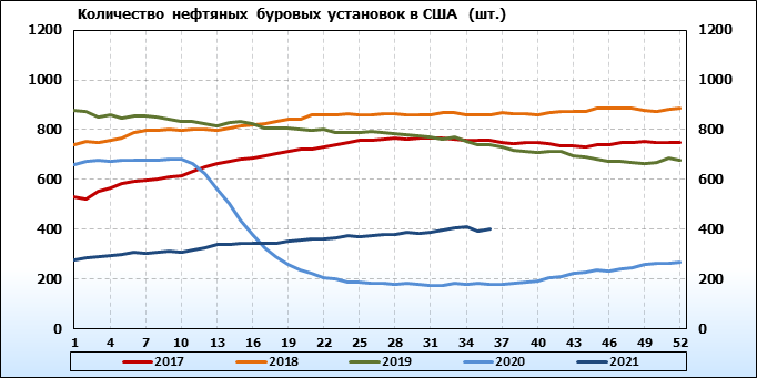 По сообщению Baker Hughes количество нефтяных буровых установок в США на 10.09.21 составило 401 штуку. За неделю количество буровых установок  выросло на 7 единиц.  На прошлой неделе количество установок, которые прекратили работу составило 3 единиц.  Количество установок, которые ввели в эксплуатацию составило 10 единиц.  Как видим, рост числа установок есть, но он незначительный.
