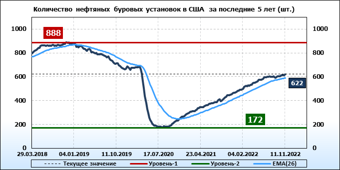 По сообщению Baker Hughes количество нефтяных буровых установок в США на 11.11.22 составило 622 штук. За неделю количество буровых установок выросло на 9 единиц. На прошлой неделе количество установок, которые прекратили работу составило 1 единицу. Количество установок, которые ввели в эксплуатацию составило 10 единиц. По итогам недели рост количества установок очевиден.