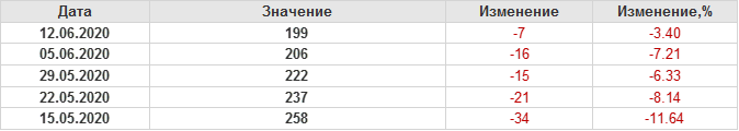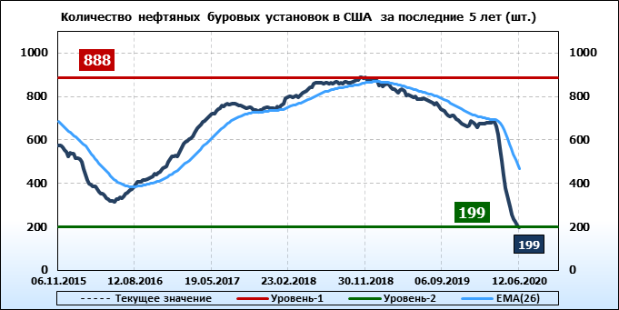 По сообщению Baker Hughes количество нефтяных буровых установок в США на 12.06.20 составило 199 штук. За неделю количество буровых установок упало на 7 единиц. На прошлой неделе количество установок, которые прекратили работу составило 7 единиц. В течение прошедшей недели ни одна установка в строй не вводилась. Видим, что по итогам недели падение числа установок незначительное.