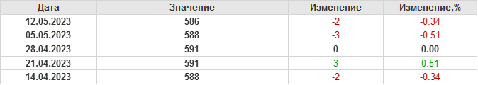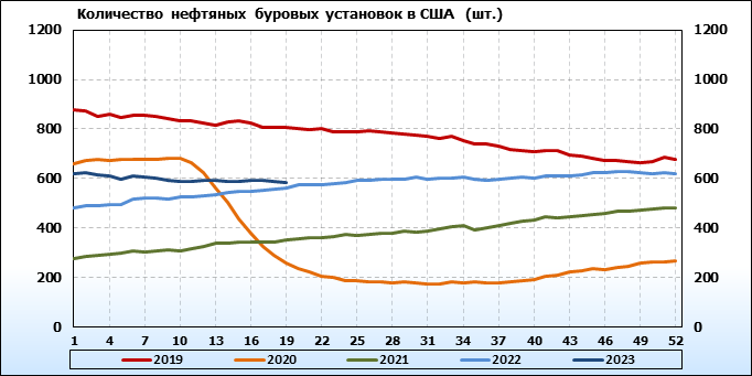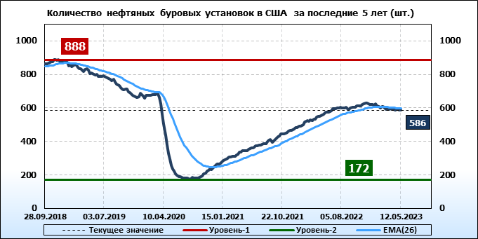 По сообщению Baker Hughes количество нефтяных буровых установок в США на 12.05.23 составило 586 штук. За неделю количество буровых установок упало на 2 единицы. На прошлой неделе количество установок, которые прекратили работу составило 6 единиц. Количество установок, которые ввели в эксплуатацию составило 4 единицы. Видим, что по итогам недели падение числа установок незначительное.