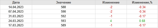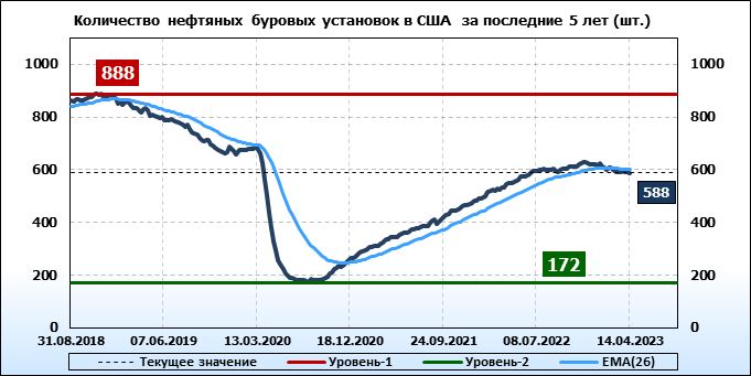 По сообщению Baker Hughes количество нефтяных буровых установок в США на 14.04.23 составило 588 штук. За неделю количество буровых установок упало на 2 единицы. На прошлой неделе количество установок, которые прекратили работу составило 7 единиц. Количество установок, которые ввели в эксплуатацию составило 5 единиц. Видим, что по итогам недели падение числа установок незначительное.