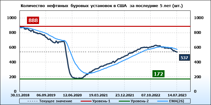По сообщению Baker Hughes количество нефтяных буровых установок в США на 14.07.23 составило 537 штук. За неделю количество буровых установок упало на 3 единицы. На прошлой неделе количество установок, которые прекратили работу составило 6 единиц. Количество установок, которые ввели в эксплуатацию составило 3 единицы. Видим, что по итогам недели падение числа установок незначительное.