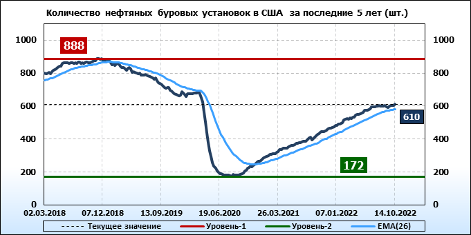 По сообщению Baker Hughes количество нефтяных буровых установок в США на 14.10.22 составило 610 штук. За неделю количество буровых установок выросло на 8 единиц. На прошлой неделе количество установок, которые прекратили работу составило 1 единицу. Количество установок, которые ввели в эксплуатацию составило 9 единиц. По итогам недели рост количества установок очевиден.