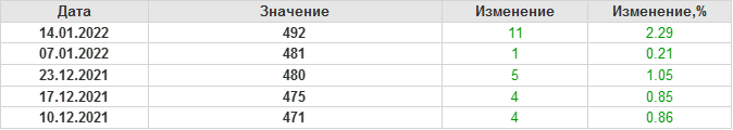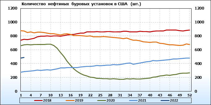 По сообщению Baker Hughes количество нефтяных буровых установок в США на 14.01.22 составило 492 штуки. За неделю количество буровых установок выросло на 11 единиц. За прошедшую неделю не было ни одной установки, которая бы прекратила работу. Количество установок, которые ввели в эксплуатацию составило 11 единиц. По итогам недели рост количества установок очевиден.