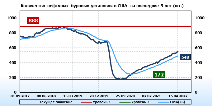 По сообщению Baker Hughes количество нефтяных буровых установок в США на 15.04.22 составило 548 штук. За неделю количество буровых установок выросло на 2 единицы. На прошлой неделе количество установок, которые прекратили работу составило 4 единицы. Количество установок, которые ввели в эксплуатацию составило 6 единиц. Как видим, рост числа установок есть, но он незначительный.