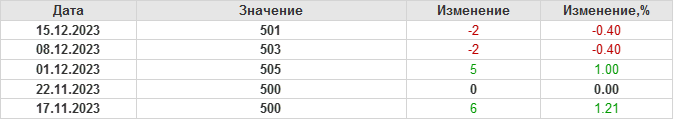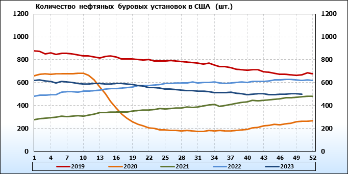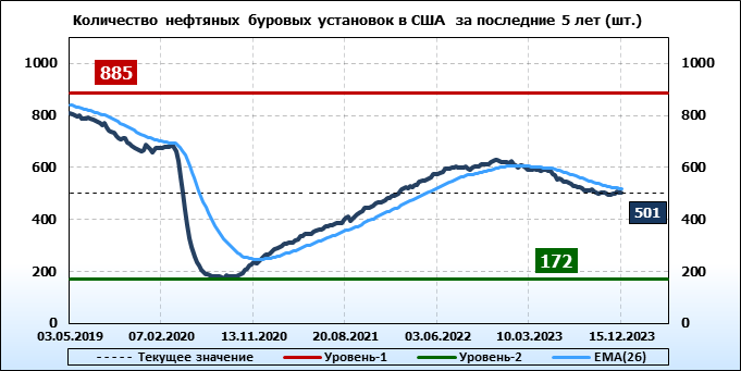По сообщению Baker Hughes количество нефтяных буровых установок в США на 15.12.23 составило 501 штуку. За неделю количество буровых установок упало на 2 единицы. На прошлой неделе количество установок, которые прекратили работу составило 79 единиц. Количество установок, которые ввели в эксплуатацию составило 77 единиц. Видим, что по итогам недели падение числа установок незначительное.