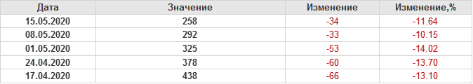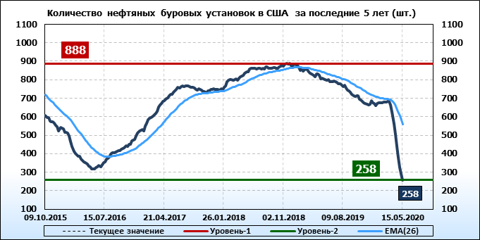 По сообщению Baker Hughes количество нефтяных буровых установок в США на 15.05.20 составило 258 штук. За неделю количество буровых установок упало на 34 единицы. На прошлой неделе количество установок, которые прекратили работу составило 34 единицы. В течение прошедшей недели ни одна установка в строй не вводилась. По итогам недели наблюдаем существенное сокращение буровых.