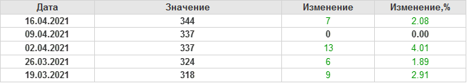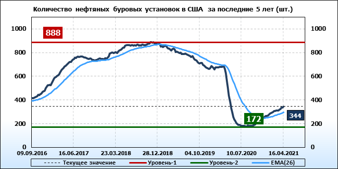 По сообщению Baker Hughes количество нефтяных буровых установок в США на 16.04.21 составило 344 штуки. За неделю количество буровых установок выросло на 7 единиц. За прошедшую неделю не было ни одной установки, которая бы прекратила работу. Количество установок, которые ввели в эксплуатацию составило 7 единиц. Как видим, рост числа установок есть, но он незначительный.