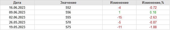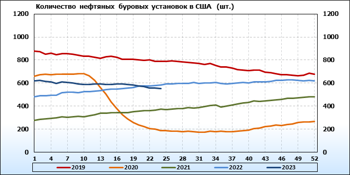 По сообщению Baker Hughes количество нефтяных буровых установок в США на 16.06.23 составило 552 штук. За неделю количество буровых установок упало на 4 единицы. На прошлой неделе количество установок, которые прекратили работу составило 7 единиц. Количество установок, которые ввели в эксплуатацию составило 3 единицы. Видим, что по итогам недели падение числа установок незначительное.