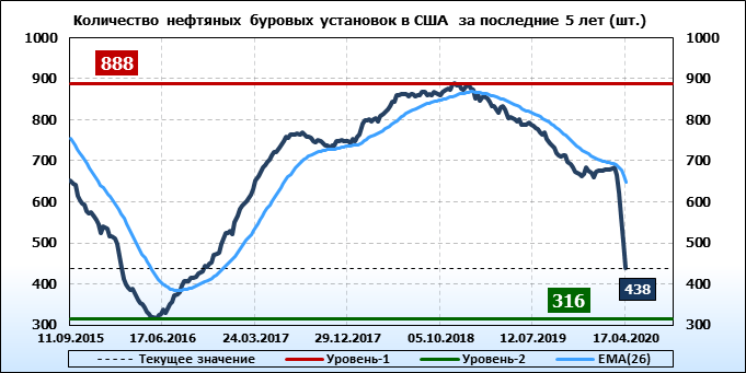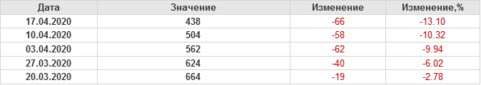 По сообщению Baker Hughes количество нефтяных буровых установок в США на 17.04.20 составило 438 штук. За неделю количество буровых установок упало на 66 единиц. На прошлой неделе количество установок, которые прекратили работу составило 66 единиц. В течение прошедшей недели ни одна установка в строй не вводилась. По итогам недели наблюдаем существенное сокращение буровых.