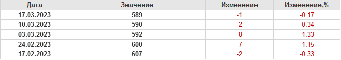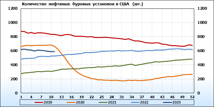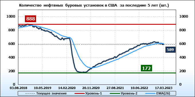 По сообщению Baker Hughes количество нефтяных буровых установок в США на 17.03.23 составило 589 штук. За неделю количество буровых установок упало на 1 единицу. На прошлой неделе количество установок, которые прекратили работу составило 8 единиц. Количество установок, которые ввели в эксплуатацию составило 7 единиц. Видим, что по итогам недели падение числа установок незначительное.