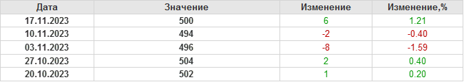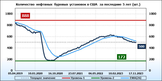 По сообщению Baker Hughes количество нефтяных буровых установок в США на 17.11.23 составило 500 штуки. За неделю количество буровых установок выросло на 6 единиц. На прошлой неделе количество установок, которые прекратили работу составило 2 единицы. Количество установок, которые ввели в эксплуатацию составило 8 единиц. Как видим, рост числа установок есть, но он незначительный.