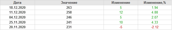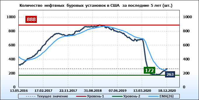 По сообщению Baker Hughes количество нефтяных буровых установок в США на 18.12.20 составило 263 штуки. За неделю количество буровых установок выросло на 5 единиц. На прошлой неделе количество установок, которые прекратили работу составило 3 единицы. Количество установок, которые ввели в эксплуатацию составило 8 единиц. Как видим, рост числа установок есть, но он незначительный.