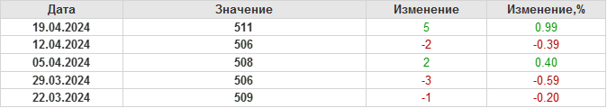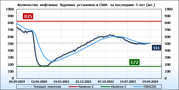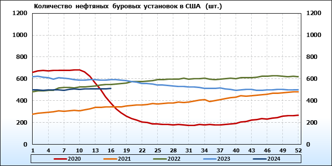 По сообщению Baker Hughes количество нефтяных буровых установок в США на 19.04.24 составило 511 штук. За неделю количество буровых установок выросло на 5 единиц.