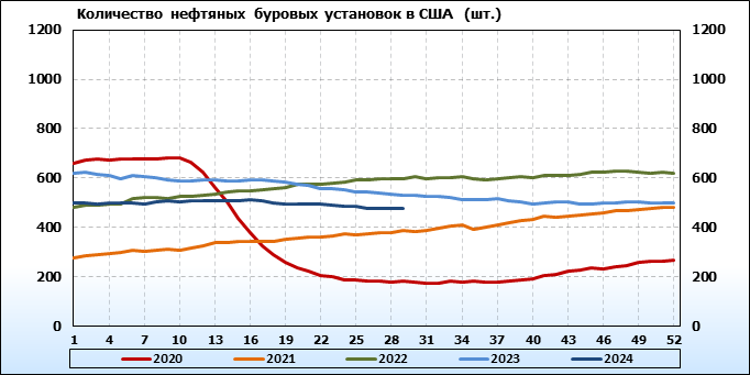 По сообщению Baker Hughes количество нефтяных буровых установок в США на 19.07.24 составило 477 штук. За неделю количество буровых установок упало на 1 единицу.