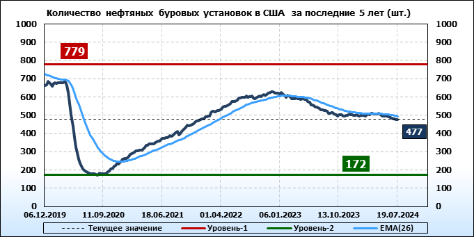 По сообщению Baker Hughes количество нефтяных буровых установок в США на 19.07.24 составило 477 штук. За неделю количество буровых установок упало на 1 единицу.