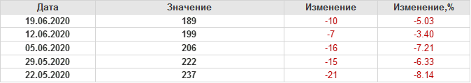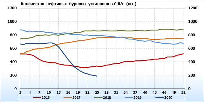 По сообщению Baker Hughes количество нефтяных буровых установок в США на 19.06.20 составило 189 штук. За неделю количество буровых установок упало на 10 единиц. На прошлой неделе количество установок, которые прекратили работу составило 10 единиц. В течение прошедшей недели ни одна установка в строй не вводилась. По итогам недели наблюдаем существенное сокращение буровых.