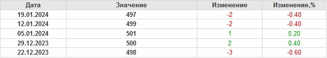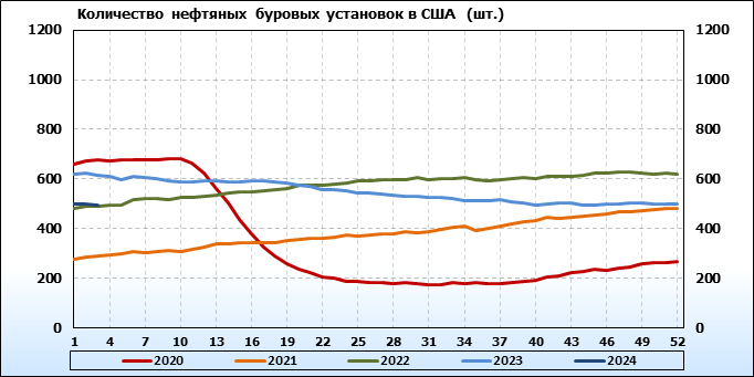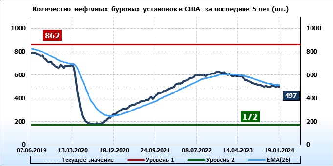 По сообщению Baker Hughes количество нефтяных буровых установок в США на 19.01.24 составило 497 штуки. За неделю количество буровых установок упало на 2 единицы. На прошлой неделе количество установок, которые прекратили работу составило 4 единицы. Количество установок, которые ввели в эксплуатацию составило 2 единицы. Видим, что по итогам недели падение числа установок незначительное.