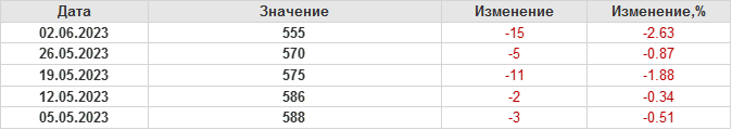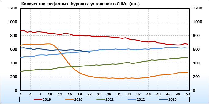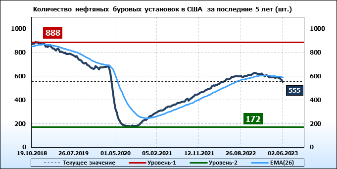 По сообщению Baker Hughes количество нефтяных буровых установок в США на 02.06.23 составило 555 штук. За неделю количество буровых установок упало на 15 единиц. На прошлой неделе количество установок, которые прекратили работу составило 15 единиц. В течение прошедшей недели ни одна установка в строй не вводилась. По итогам недели наблюдаем существенное сокращение буровых.