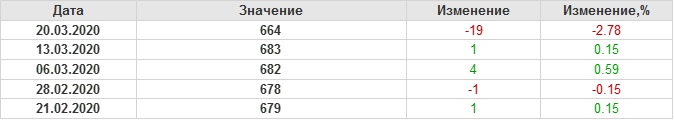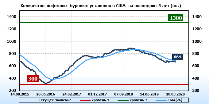 По сообщению Baker Hughes количество нефтяных буровых установок в США на 20.03.20 составило 664 штуки. За неделю количество буровых установок упало на 19 единиц. На прошлой неделе количество установок, которые прекратили работу составило 20 единиц. Количество установок, которые ввели в эксплуатацию составило 1 единицу. По итогам недели наблюдаем существенное сокращение буровых.
