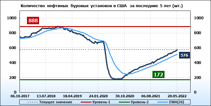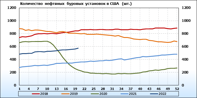 По сообщению Baker Hughes количество нефтяных буровых установок в США на 20.05.22 составило 576 штук. За неделю количество буровых установок выросло на 13 единиц. На прошлой неделе количество установок, которые прекратили работу составило 1 единицу. Количество установок, которые ввели в эксплуатацию составило 14 единиц. По итогам недели рост количества установок очевиден.