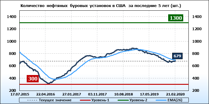 По сообщению Baker Hughes количество нефтяных буровых установок в США на 21.02.20 составило 679 штук. За неделю количество буровых установок выросло на 1 единицу. На прошлой неделе количество установок, которые прекратили работу составило 1 единицу. Количество установок, которые ввели в эксплуатацию составило 2 единицы. Как видим, рост числа установок есть, но он незначительный.