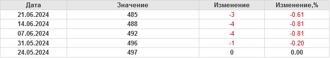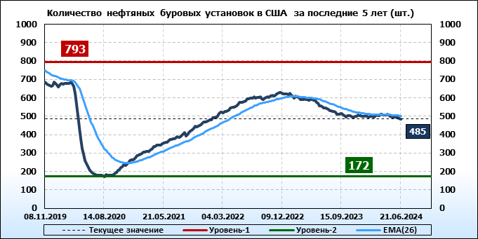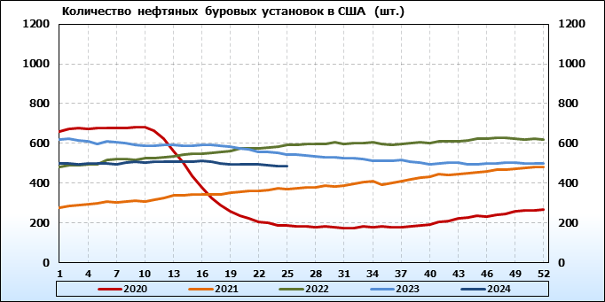 По сообщению Baker Hughes количество нефтяных буровых установок в США на 21.06.24 составило 485 штук. За неделю количество буровых установок упало на 3 единицы.