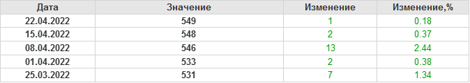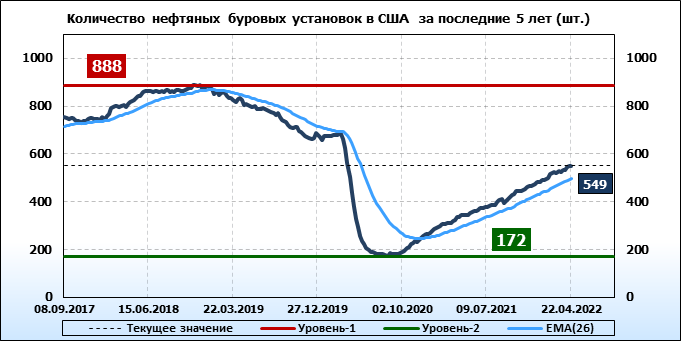 По сообщению Baker Hughes количество нефтяных буровых установок в США на 22.04.22 составило 549 штук. За неделю количество буровых установок выросло на 1 единицу. На прошлой неделе количество установок, которые прекратили работу составило 3 единицы. Количество установок, которые ввели в эксплуатацию составило 4 единицы. Как видим, рост числа установок есть, но он незначительный.