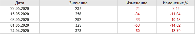 По сообщению Baker Hughes количество нефтяных буровых установок в США на 22.05.20 составило 237 штук. За неделю количество буровых установок упало на 21 единицу. На прошлой неделе количество установок, которые прекратили работу составило 21 единицу. В течение прошедшей недели ни одна установка в строй не вводилась. По итогам недели наблюдаем существенное сокращение буровых.