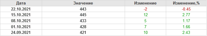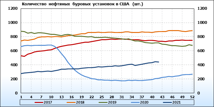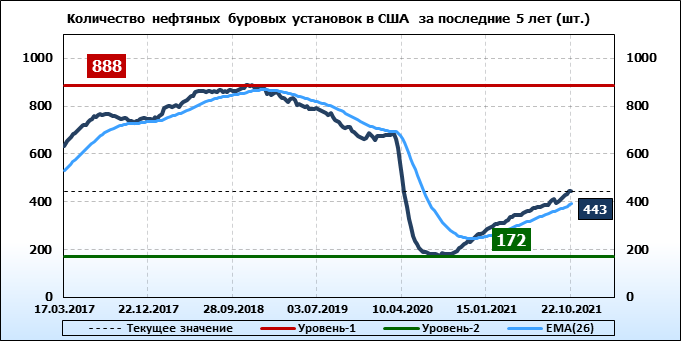 По сообщению Baker Hughes количество нефтяных буровых установок в США на 22.10.21 составило 443 штуки. За неделю количество буровых установок упало на 2 единицы. На прошлой неделе количество установок, которые прекратили работу составило 3 единицы. Количество установок, которые ввели в эксплуатацию составило 1 единицу. Видим, что по итогам недели падение числа установок незначительное.
