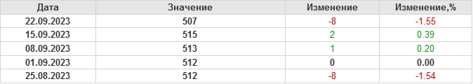 По сообщению Baker Hughes количество нефтяных буровых установок в США на 22.09.23 составило 507 штук. За неделю количество буровых установок упало на 8 единиц. На прошлой неделе количество установок, которые прекратили работу составило 10 единиц. Количество установок, которые ввели в эксплуатацию составило 2 единицы. По итогам недели наблюдаем существенное сокращение буровых.