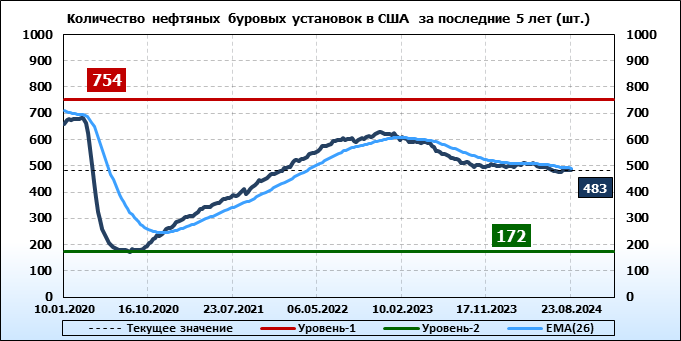 По сообщению Baker Hughes количество нефтяных буровых установок в США на 23.08.24 составило 483 штуки. За неделю количество буровых установок осталось неизменным.
