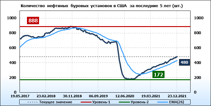 По сообщению Baker Hughes количество нефтяных буровых установок в США на 23.12.21 составило 480 штук. За неделю количество буровых установок выросло на 5 единиц. На прошлой неделе количество установок, которые прекратили работу составило 3 единицы. Количество установок, которые ввели в эксплуатацию составило 8 единиц. Как видим, рост числа установок есть, но он незначительный.