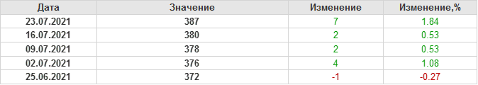 По сообщению Baker Hughes количество нефтяных буровых установок в США на 23.07.21 составило 387 штук. За неделю количество буровых установок выросло на 7 единиц. За прошедшую неделю не было ни одной установки, которая бы прекратила работу. Количество установок, которые ввели в эксплуатацию составило 7 единиц. Как видим, рост числа установок есть, но он незначительный.