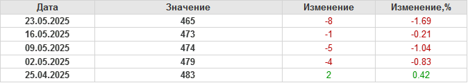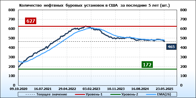 По сообщению Baker Hughes количество нефтяных буровых установок в США на 23.05.25 составило 465 штук. За неделю количество буровых установок упало на 8 единиц.