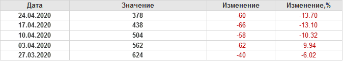 По сообщению Baker Hughes количество нефтяных буровых установок в США на 24.04.20 составило 378 штук. За неделю количество буровых установок упало на 60 единиц. На прошлой неделе количество установок, которые прекратили работу составило 60 единиц. В течение прошедшей недели ни одна установка в строй не вводилась. По итогам недели наблюдаем существенное сокращение буровых.