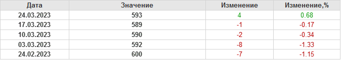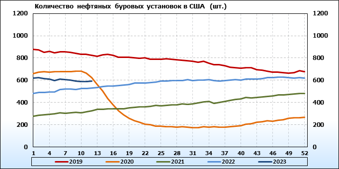 По сообщению Baker Hughes количество нефтяных буровых установок в США на 24.03.23 составило 593 штуки. За неделю количество буровых установок выросло на 4 единицы. На прошлой неделе количество установок, которые прекратили работу составило 2 единицы. Количество установок, которые ввели в эксплуатацию составило 6 единиц. Как видим, рост числа установок есть, но он незначительный.
