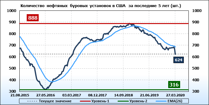 По сообщению Baker Hughes количество нефтяных буровых установок в США на 27.03.20 составило 624 штуки. За неделю количество буровых установок упало на 40 единиц. На прошлой неделе количество установок, которые прекратили работу составило 40 единиц. В течение прошедшей недели ни одна установка в строй не вводилась. По итогам недели наблюдаем существенное сокращение буровых.