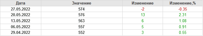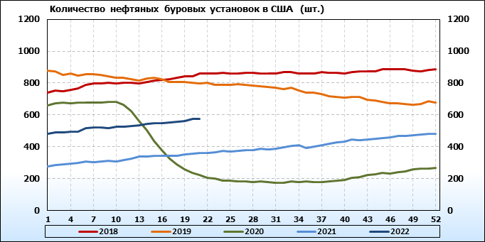 По сообщению Baker Hughes количество нефтяных буровых установок в США на 27.05.22 составило 574 штуки. За неделю количество буровых установок упало на 2 единицы. На прошлой неделе количество установок, которые прекратили работу составило 6 единиц. Количество установок, которые ввели в эксплуатацию составило 4 единицы. Видим, что по итогам недели падение числа установок незначительное.